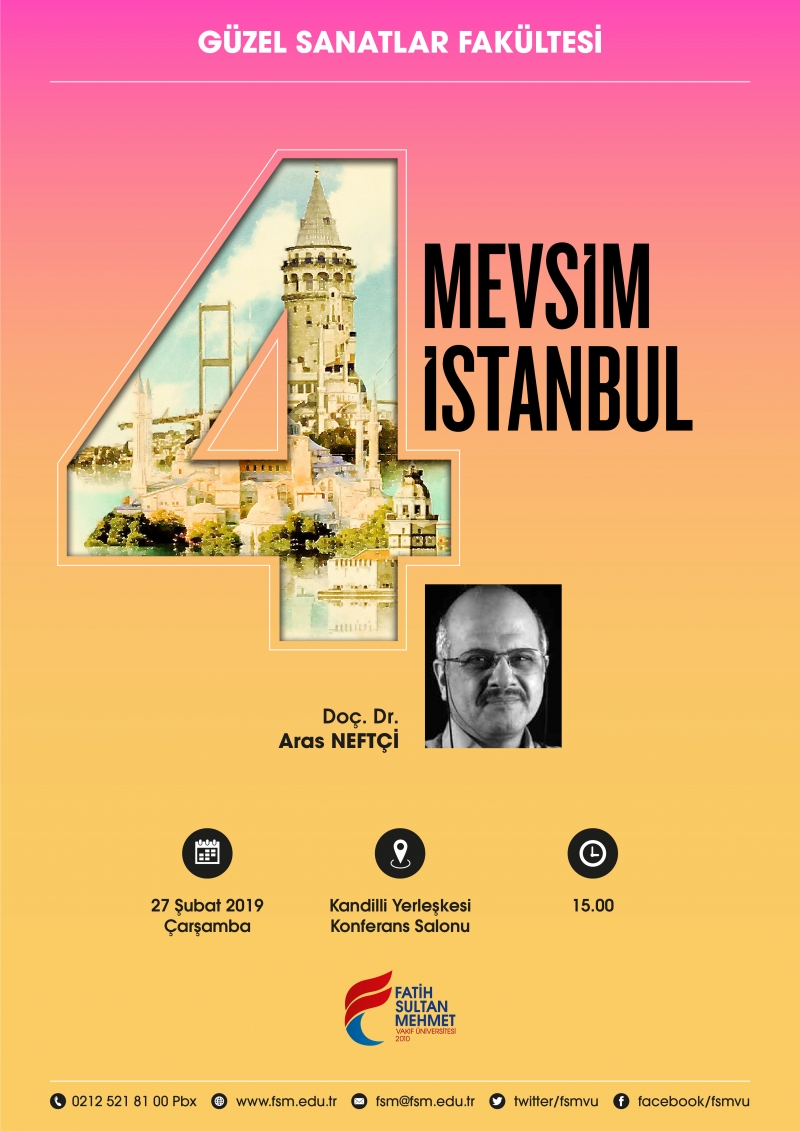 27 Şubat 2019 Çarşamba günü Yüksek Mimar Aras Neftçi'nin "4 Mevsim İstanbul" üzerine gerçekleştireceği konferans saat 15:00'da Kandilli Yerleşkesi Konferans Salonunda dinleyicilerle buluşacak.