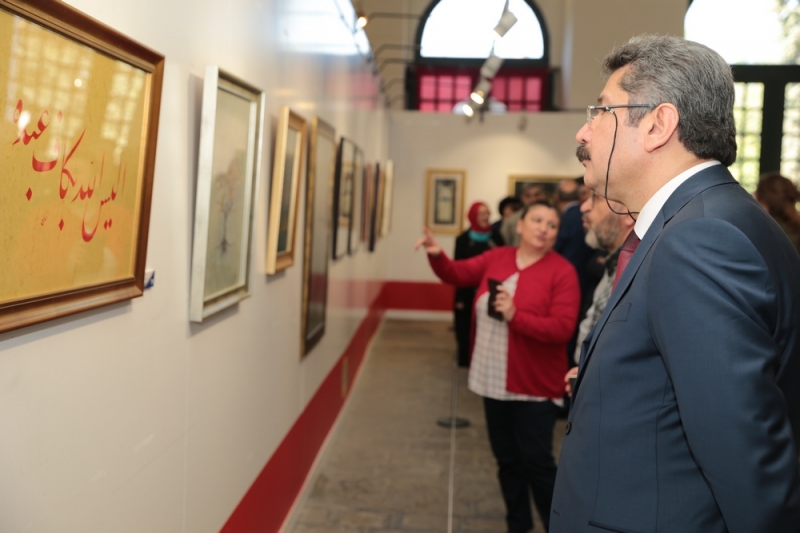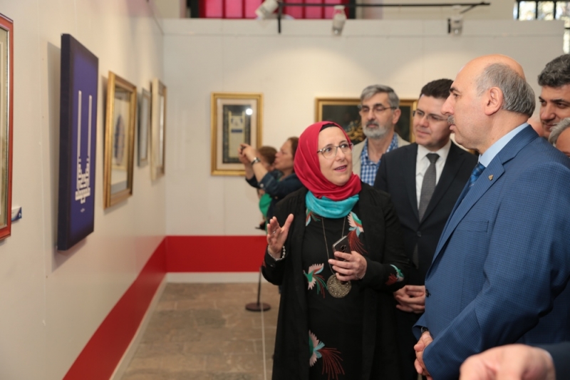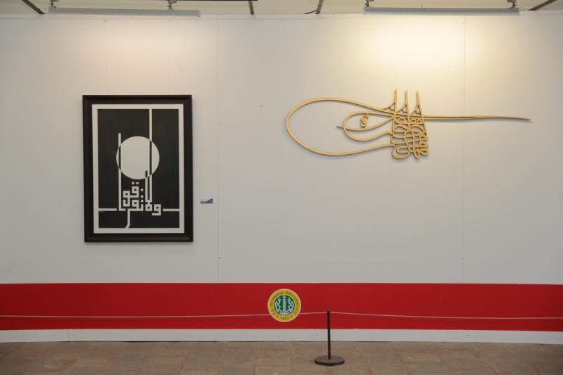 Fatih Sultan Mehmet Vakıf Üniversitesi Güzel Sanatlar Fakültesi Dekanı hattat Prof. Dr. M. Hüsrev Subaşı, sanatçılar olarak ömürlerini genç nesillerin güzeli görebilmesine, güzeli anlamasına adadıklarını söyleyerek, “Burada görecekleriniz dünyadan bir kesit. Özellikle kapıdan girdiğiniz zaman göreceğiniz Fatih Sultan Mehmet Han’ın tuğrasını eldeki mevcut fermanlardan, beratlardan yola çıkarak ahşap üzerine uyguladık. Onun hemen yanında siyah zemin üzerinde bir levha var. Makıli geometrik kufi denen yazı türünde dik harflerle bir ayet yazıyor. Ayetin manası şu: ‘Bölücülük yapmayın, tefrikaya düşmeyin.’ Fatih’in büyük tuğrasıyla bu ayetin aynı panoda yan yana gelmesinin büyük anlamı var. Türkiye’nin her zamankinden daha çok birlik ve beraberliğe ihtiyacı olduğu zamanda bu tablonun çok anlamlı olduğunu düşünüyorum.” değerlendirmesinde bulundu.